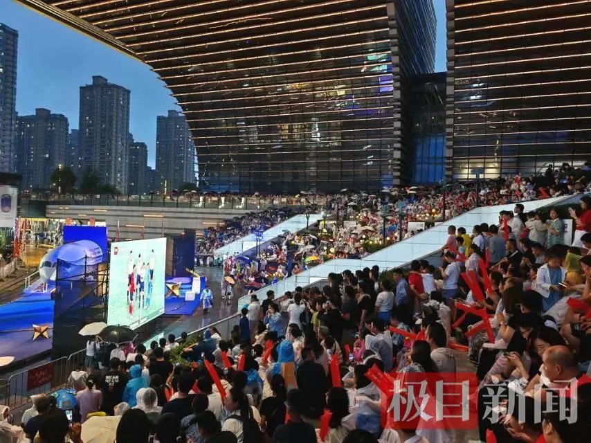 记者在文化广场观赛区看到,现场设置了户外大屏对比赛进行直播,台阶上座无虚席,很多球迷和市民站在后方撑伞观赛,并为两个球队加油,氛围拉满。